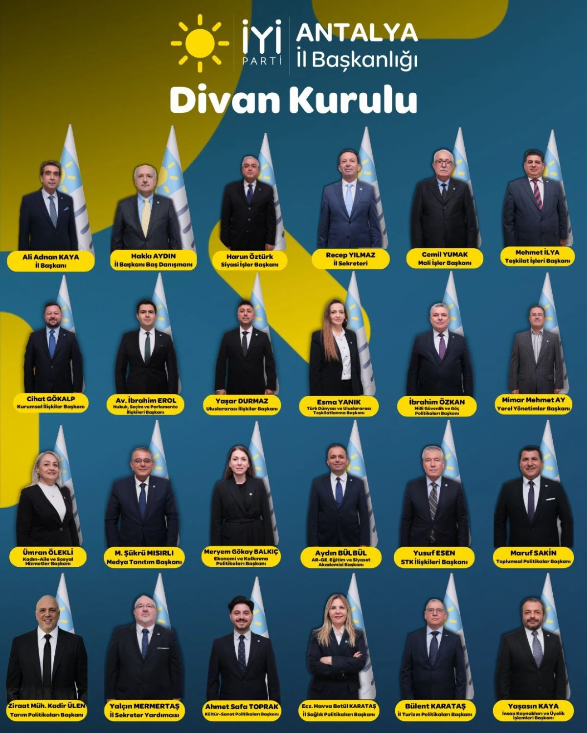 İl Divan Kurulu’nda yer alan diğer isimler arasında Cihat Gökalp (Kurumsal İlişkiler), İbrahim Erol (Hukuk ve Parlamento İlişkileri), Esma Yanık (Türk Dünyası ve Uluslararası Teşkilatlanma), İbrahim Özkan (Milli Güvenlik ve Göç Politikaları), Mehmet Ay (Yerel Yönetimler), M. Şükrü Mısırlı (Medya Tanıtım), Aydın Bülbül (AR-GE ve Eğitim), Yusuf Esen (STK İlişkileri), Maruf Sakin (Toplumsal Politikalar), Kadir Ülen (Tarım Politikaları), Ahmet Safa Toprak (Kültür-Sanat), Bülent Karataş (Turizm), Yaşasın Kaya (İnsan Kaynakları), Hakkı Aydın (Başdanışman) ve Yalçın Mermertaş (İl Sekreter Yardımcısı) bulunuyor.