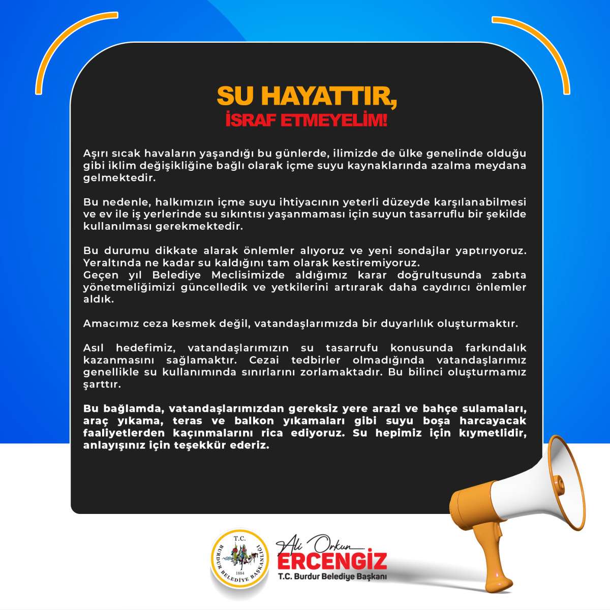 Başkan Ercengiz “Aşırı sıcak havaların yaşandığı bu günlerde, ilimizde de ülke genelinde olduğu gibi iklim değişikliğine bağlı olarak içme suyu kaynaklarında azalma meydana gelmektedir. Bu nedenle, halkımızın içme suyu ihtiyacının yeterli düzeyde karşılanabilmesi ve ev ile iş yerlerinde su sıkıntısı yaşanmaması için suyun tasarruflu bir şekilde kullanılması gerekmektedir. Bu durumu dikkate alarak önlemler alıyoruz ve yeni sondajlar yaptırıyoruz. Yeraltında ne kadar su kaldığını tam olarak kestiremiyoruz. Geçen yıl Belediye Meclisimizde aldığımız karar doğrultusunda zabıta yönetmeliğimizi güncelledik ve yetkilerini artırarak daha caydırıcı önlemler aldık. Amacımız ceza kesmek değil, vatandaşlarımızda bir duyarlılık oluşturmaktır. Asıl hedefimiz, vatandaşlarımızın su tasarrufu konusunda farkındalık kazanmasını sağlamaktır. Cezai tedbirler olmadığında vatandaşlarımız genellikle su kullanımında sınırlarını zorlamaktadır. Bu bilinci oluşturmamız şarttır. Bu bağlamda, vatandaşlarımızdan gereksiz yere arazi ve bahçe sulamaları, araç yıkama, teras ve balkon yıkamaları gibi suyu boşa harcayacak faaliyetlerden kaçınmalarını rica ediyoruz. Su hepimiz için kıymetlidir, israf etmeyelim anlayışınız için teşekkür ederiz” dedi.