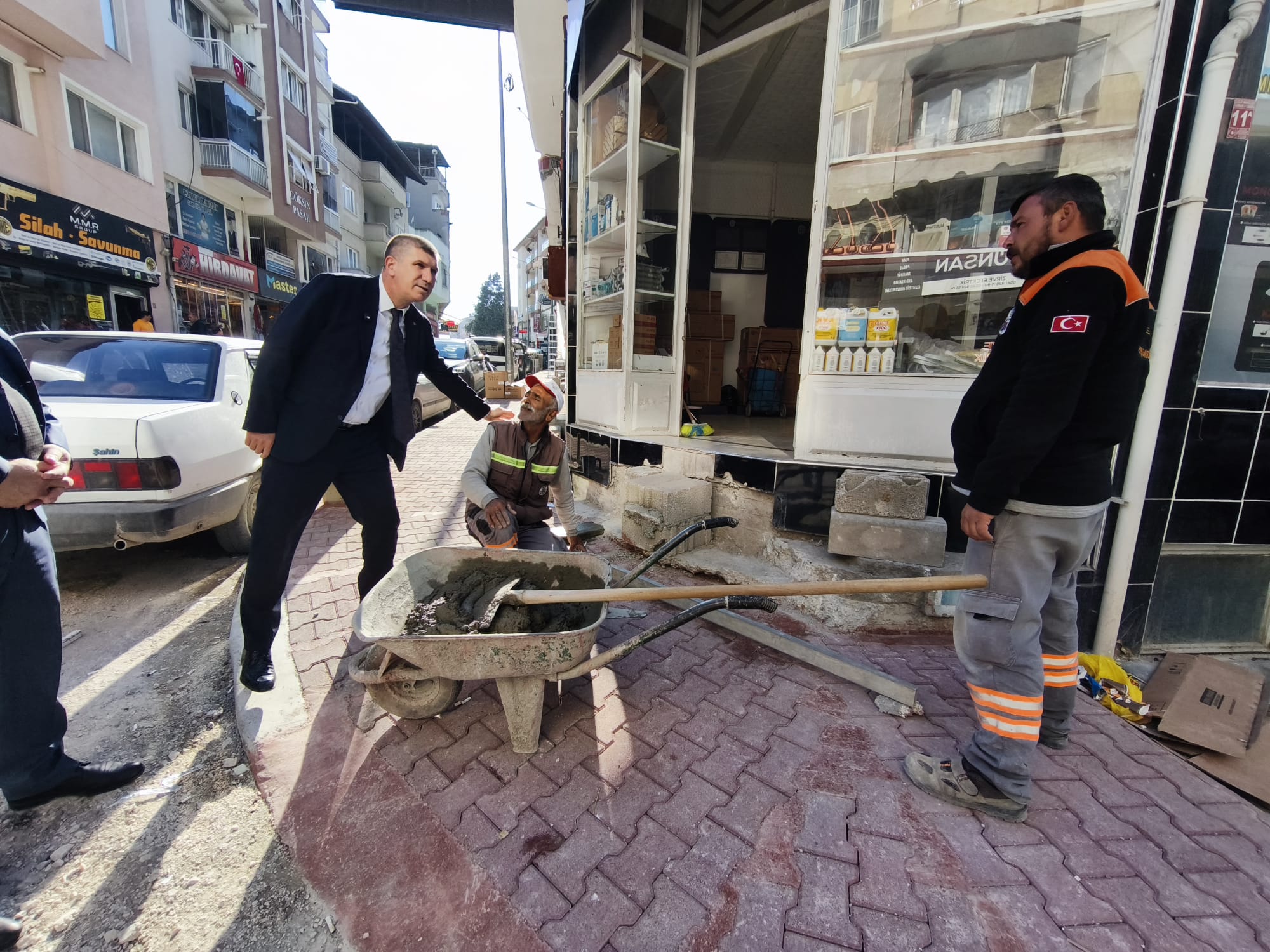 kaldırım düzenleme çalışmalarının tamamlanma aşamasında esnafı ziyaret etti.