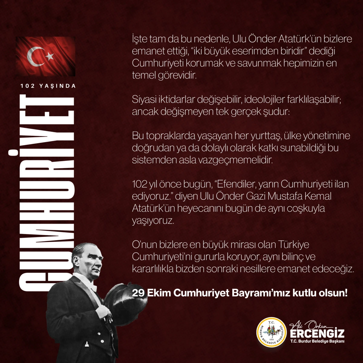 Burdur Belediye Başkanı Ali Orkun Ercengiz’in Kaleminden Cumhuriyet Bayramı Yazısı