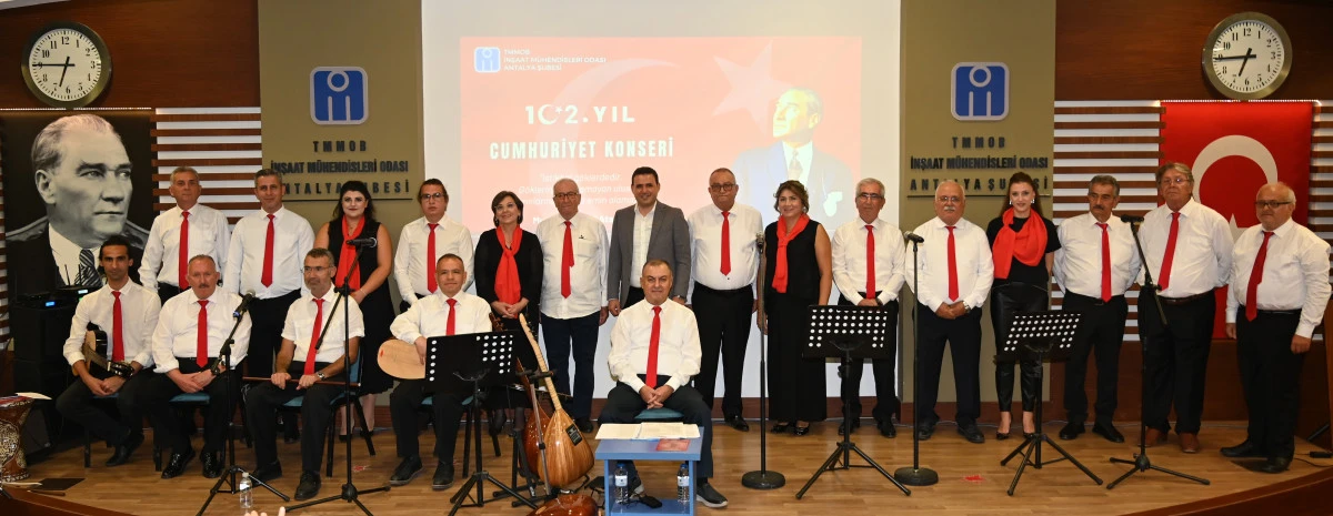 ANTALYA - İnşaat Mühendisleri Odası (İMO) Antalya Şubesi, Cumhuriyetimizin 102. kuruluş yıl dönümünü anlamlı bir etkinlikle kutladı. 18 Ekim Cumartesi akşamı saat 19.00’da Şube Hizmet Binası Atatürk Konferans Salonu’nda gerçekleşen “102. Yıl Cumhuriyet Konseri”, yoğun katılım ve büyük beğeniyle tamamlandı.