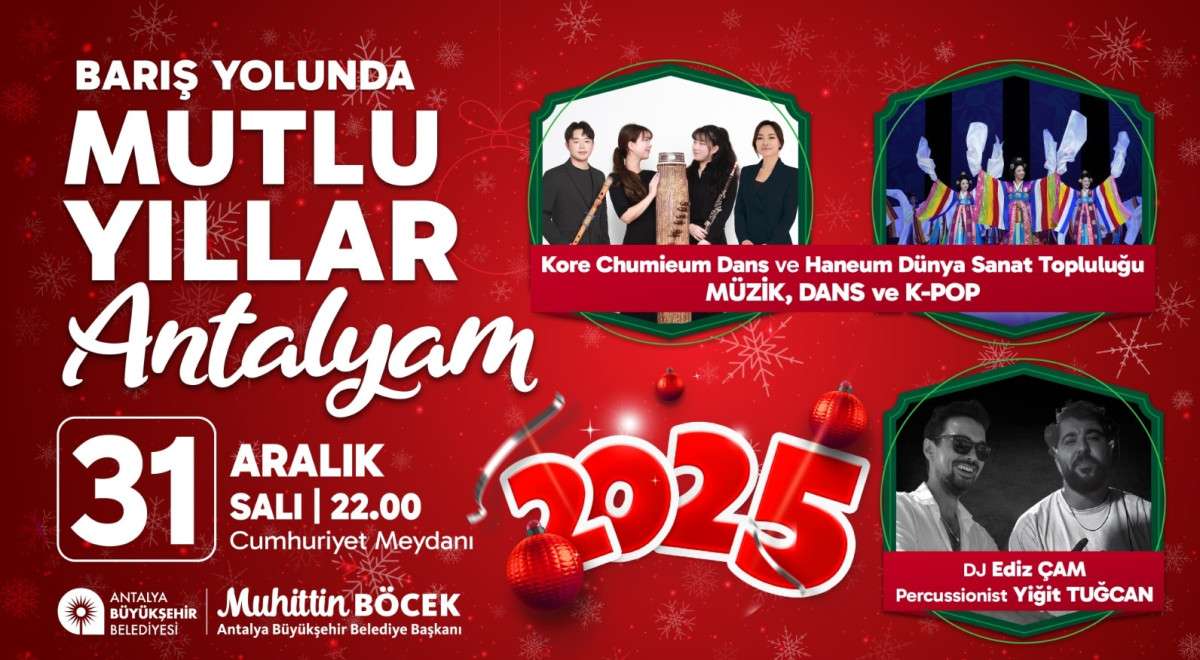 Antalya Büyükşehir Belediyesi ev sahipliğinde düzenlenecek 30. Dünya Barışına Çağrı Etkinlikleri kapsamında 31 Aralık Salı gecesi, Antalya Cumhuriyet Meydanı’nda Güney Kore’den gelen dans ve müzik grubu ile dünyaya barış çağrısında bulunulacak. Etkinlikte DJ Ediz Çam ve Pürküsyonist Yiğit Tuğcan da performanslarıyla Antalyalılara unutulmaz bir yeni yıl akşamı yaşatacak.