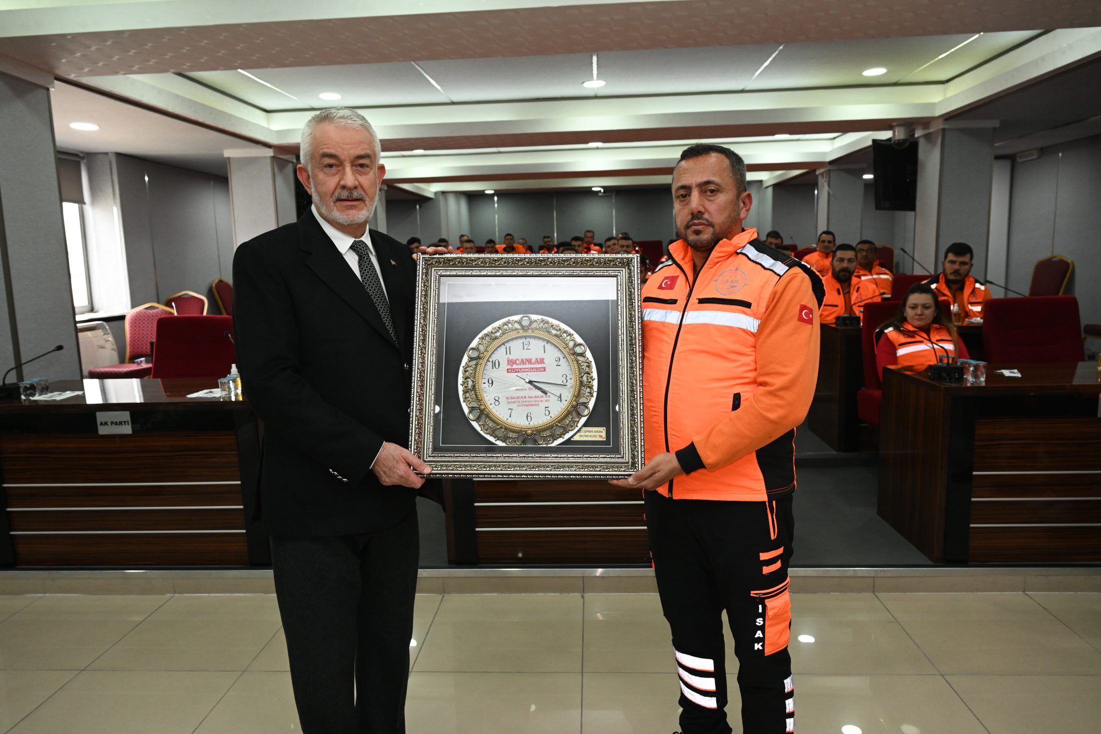 Törenin sonunda ISAK " class="text-dark font-weight-bold" target="_blank"> ISAK ekibi, akreditasyon belgesini Başkan Başdeğirmen’e takdim etti. Ayrıca Kahramanmaraş’ta enkazdan 72 saat sonra kurtarılan Gülten Hanım’ın hatıra olarak verdiği duvar saati de Başkan’a sunuldu.
