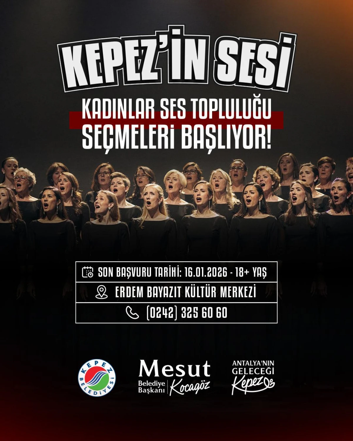 Kepez Belediyesi, müziğe yetenekli kadınları bir araya getirmek için “Kepez’in Sesi Kadınlar Ses Topluluğu”nu kuruyor. Koroya katılmak isteyenler için son başvuru tarihi 16 Ocak olarak açıklandı.